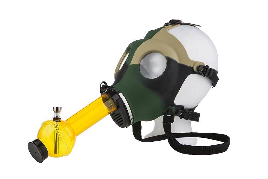 Bong Dreamliner, cu masca, pentru fumat. Masca de tip camuflaj este realizata din cauciuc, cu bong galben din acril.
