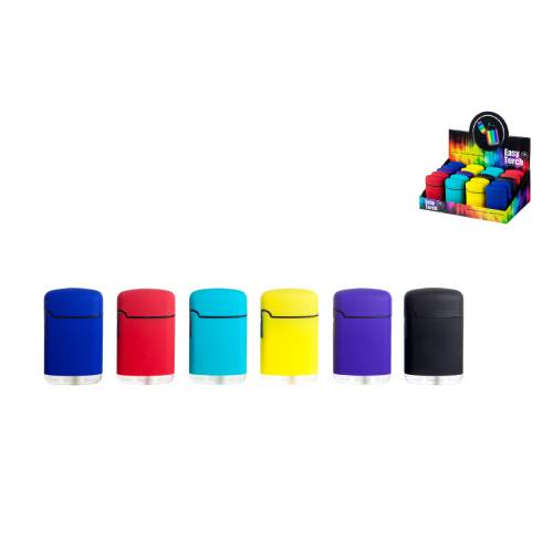 Bricheta Torch cu capac. Realizata din plastic si finish catifelat, bricheta are flacara torch ce asigura o aprindere uniforma pe intreaga circumferinta a trabucului. Bricheta disponibila in 6 culori - albastru, rosu, bleu, galben, mov, negru - in cadrul unui display cu 20 bucati. Culoarea produsului se livreaza in functie de stocul disponibil.