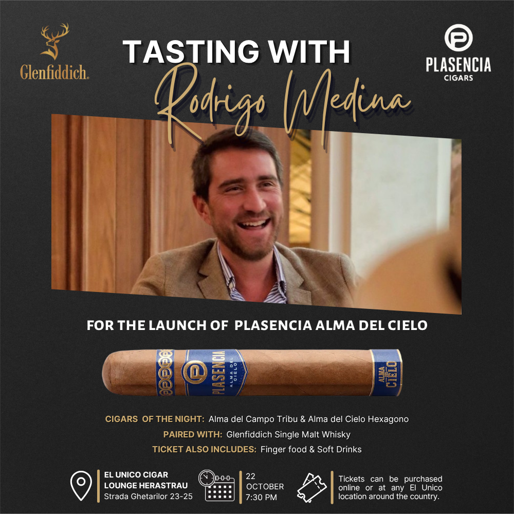 Suntem onorați să îl întâmpinăm pe Rodrigo Medina Mendieta, director regional EMEA & Asia al Plasencia Cigars, care ne va împărtăși din cunoștințele sale și ne va conduce într-o călătorie unică de degustare.