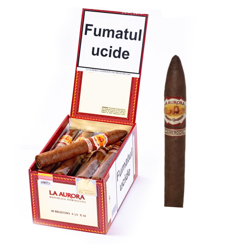 Trabucurile La Aurora 1903 Cameroon Belicoso (20), au o tarie medie spre inalta, o lungime de 158mm, un inel de 52, iar cutia contine 20 trabucuri atent concepute.
