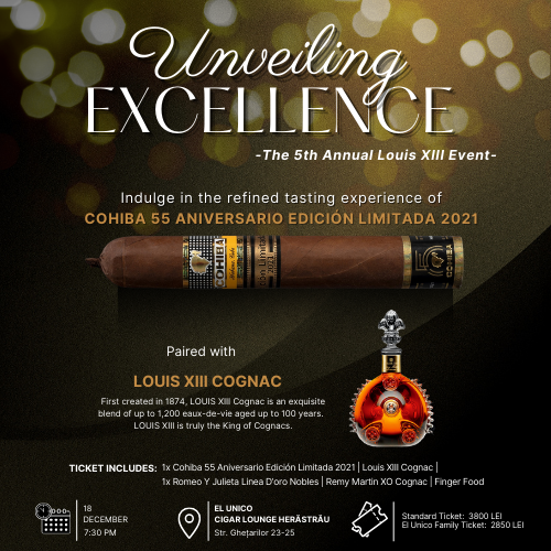 Pășește într-o lume a luxului cu un pairing rafinat între prestigiosul trabuc Cohiba 55 Aniversario și legendarul Louis XIII Cognac, un amestec opulent creat din eaux-de-vie maturate până la 100 de ani. Răsfață-ți simțurile la acest eveniment extraordinar, o celebrare a măiestriei și rafinamentului.